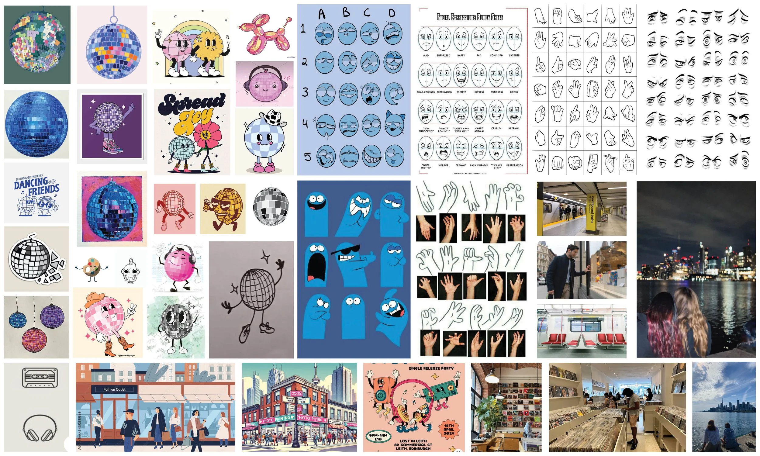 I went on my camera roll and Pinterest to collect inspiration of animated objects for the characters, their expressions, and places in the city.